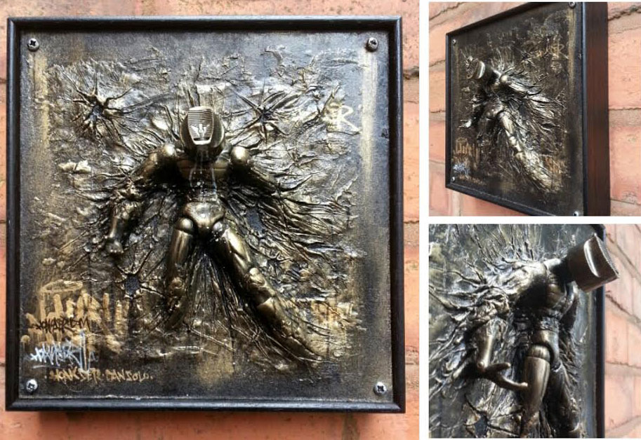 I spotted this sick resin wall art piece by UK based Graffiti artist/Toy Customizer, Hoakser on SpankyStokes.com called “Can Solo”. It’s a dope twist on the the iconic image of popular Star Wars character Han Solo encased in ‘carbonite. In this piece Hoakser used some action figure-parts, some sculpture work, some acrylic paint work before getting it lacquered and framed. The end result is Graffiti Sculpture dopeness!!