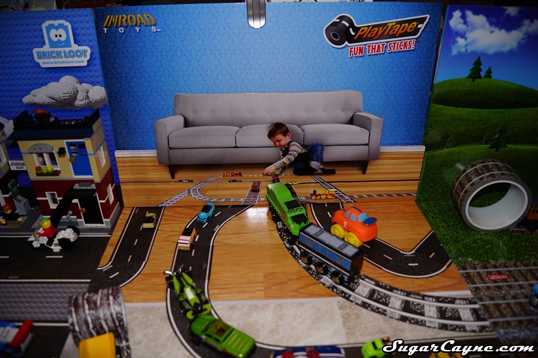Award-winning PlayTape is the fastest, best way to lay down roads or train tracks for creative play with toy cars and trains, bringing hours of imaginative entertainment at minimal cost and maximal convenience. Use the toy cars and trains you already have to drive on PlayTape. Use the blocks and toy buildings you already have to build a town through which PlayTape traffic flows. Create places real or imaginary. The possibilities are as endless as a desert highway.