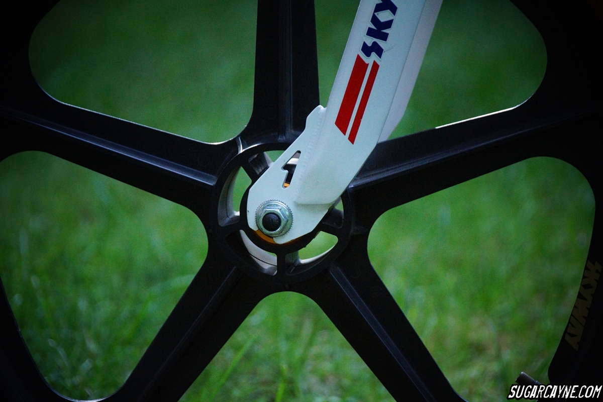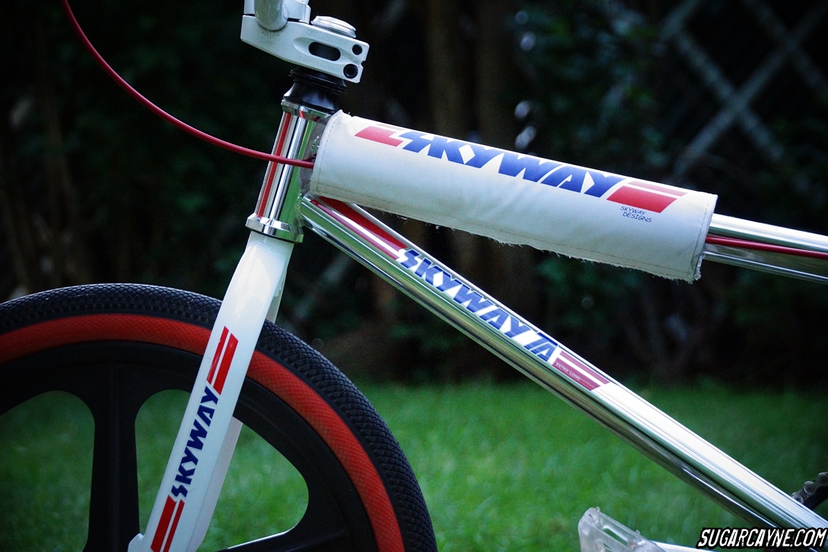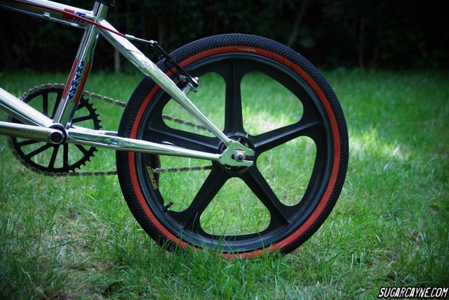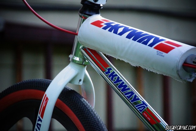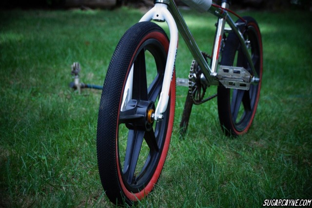 I recently did a photo shoot of his 2013 Skyway T/A and I loved the way the photos came out. The colorway of this build is so on point!! It’s all about those Vee Red Wall Speedster tires on those black graphite Tuff Wheels that make this bike really stand out. Originally I had the chrome Skyway forks on the bike but I wanted to see what the bike would look like with the white forks and it looks Dope!