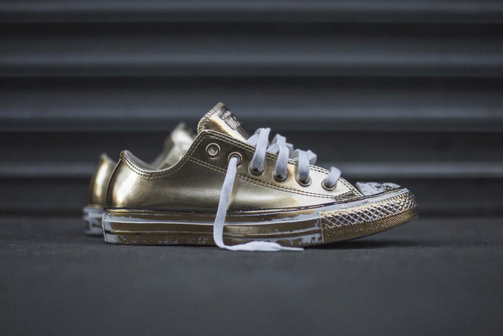 For all you ladies out there looking for some new flashy kicks, Converse got you with their new Chuck Taylor All Star Metalic Pack. Both the hi and low cut kicks have been “dipped” with metallic silver and gold across their uppers. The one thing we found odd was the distressed rubber midsoles finish….we’re guessing because they’ll wind up that way after a few days of walking around in them? The kicks also come with white lacing and embossed branding.
