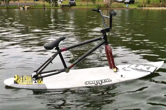 Now here’s a water sport that’s right up our alley…BIKE SURFING!!! Yes, Australian based, wheels, water and lifestyle clothing brand LKI just released their new Bike-surfing concept today and we’re loving it. They literally attached a 20in” BMX bike (without the wheels of course) to a surfboard and BOOM!!! A new action sport is created!!!