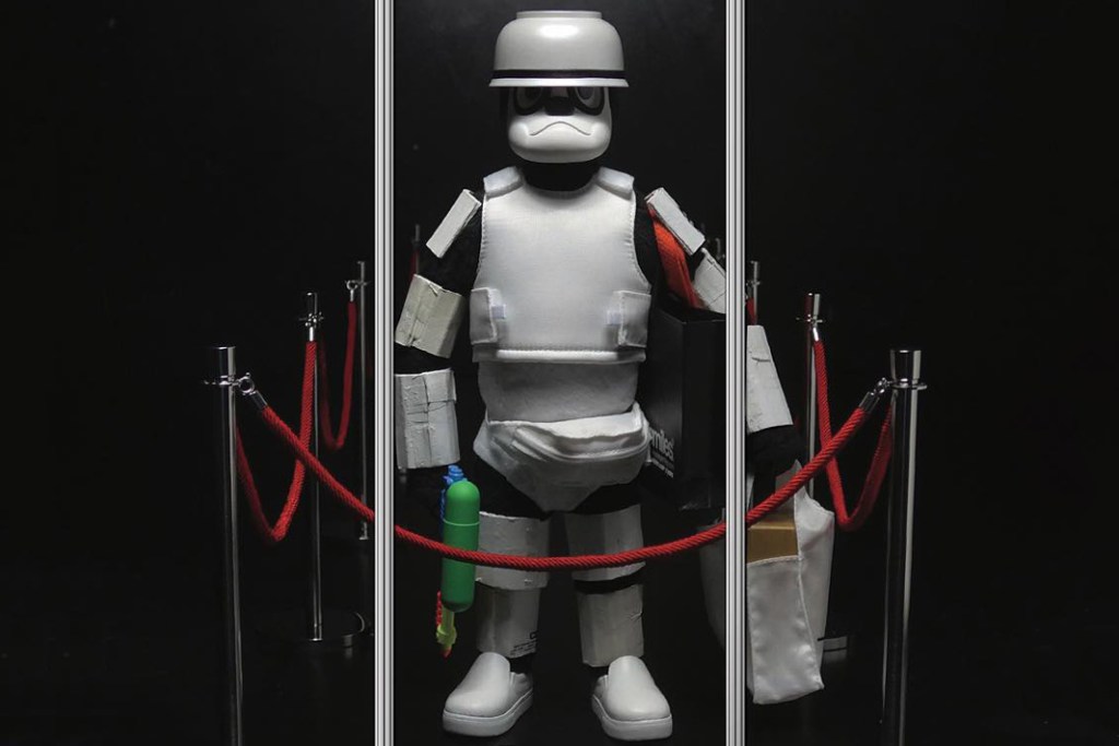 Hong Kong-based toy designer Michael Lau is one of our favorites! Everything he creates is straight up awesome sauce. Well the legendary toy maker has released a new set of collectibles, inspired by Star Wars. Of course he put his own spin on some of the iconic characters of the film franchise by mashing them up with his GARDENER series figures. His new SM3 set includes the MAXX SLEEPWALKER (Luke Skywalker), T3AO (C3P0) and DARTH FIGURE (Darth Vader) which stand around 6″ tall. He also did a 12″ STOREFAN$UMER, loosely based on a Stormtrooper, includes a “Take Away Bowl” helmet, cash bag, water gun and over sized tote, with its own velvet rope and stanchion. See what were saying…..Straight Up Awesome Sauce!!!!