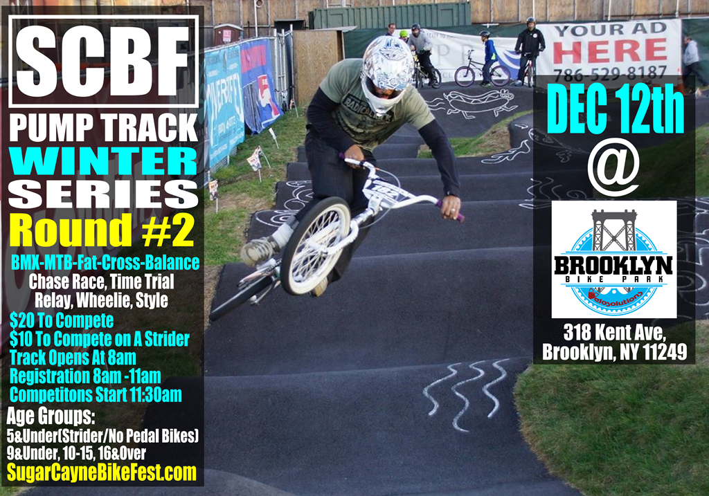 Round two of the SCBF Pump Track Winter Series at Brooklyn Bike Park is going down this Saturday Dec 12th!! We’ll be doing a more time trails, time trial relay and chase races. We’ll also be doing a longest wheelie and best style competitions at the event.