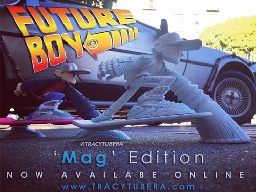 “FUTURE BOY ‘MAG’ EDITION- A hand crafted Resin Sculpture, made in collaboration with MANA STUDIOS (http://www.manastudios.biz/), & based on my popular FUTURE BOY print. This 5.75 IN. Tall and 9 IN. in Length Resin Sculpture is HAND CRAFTED & HAND PAINTED. Limited to ONLY 100. This is the SECOND colorway for FUTURE BOY and was an Exclusive at DESIGNER CON 2015.” ~Tracy Tubera
