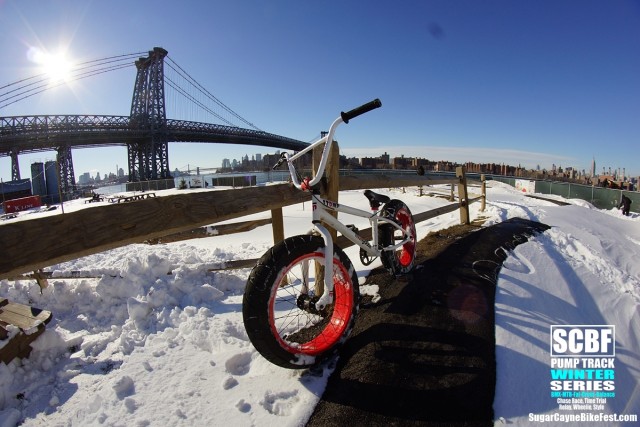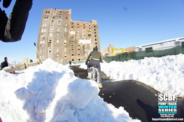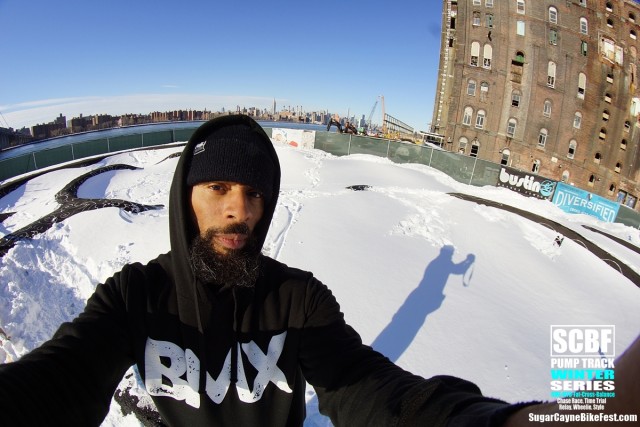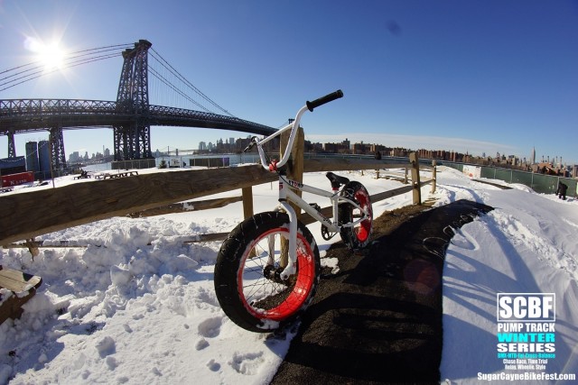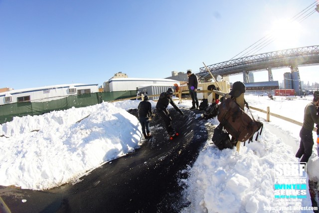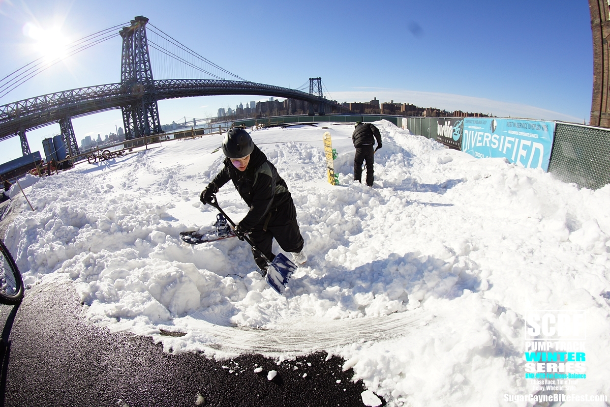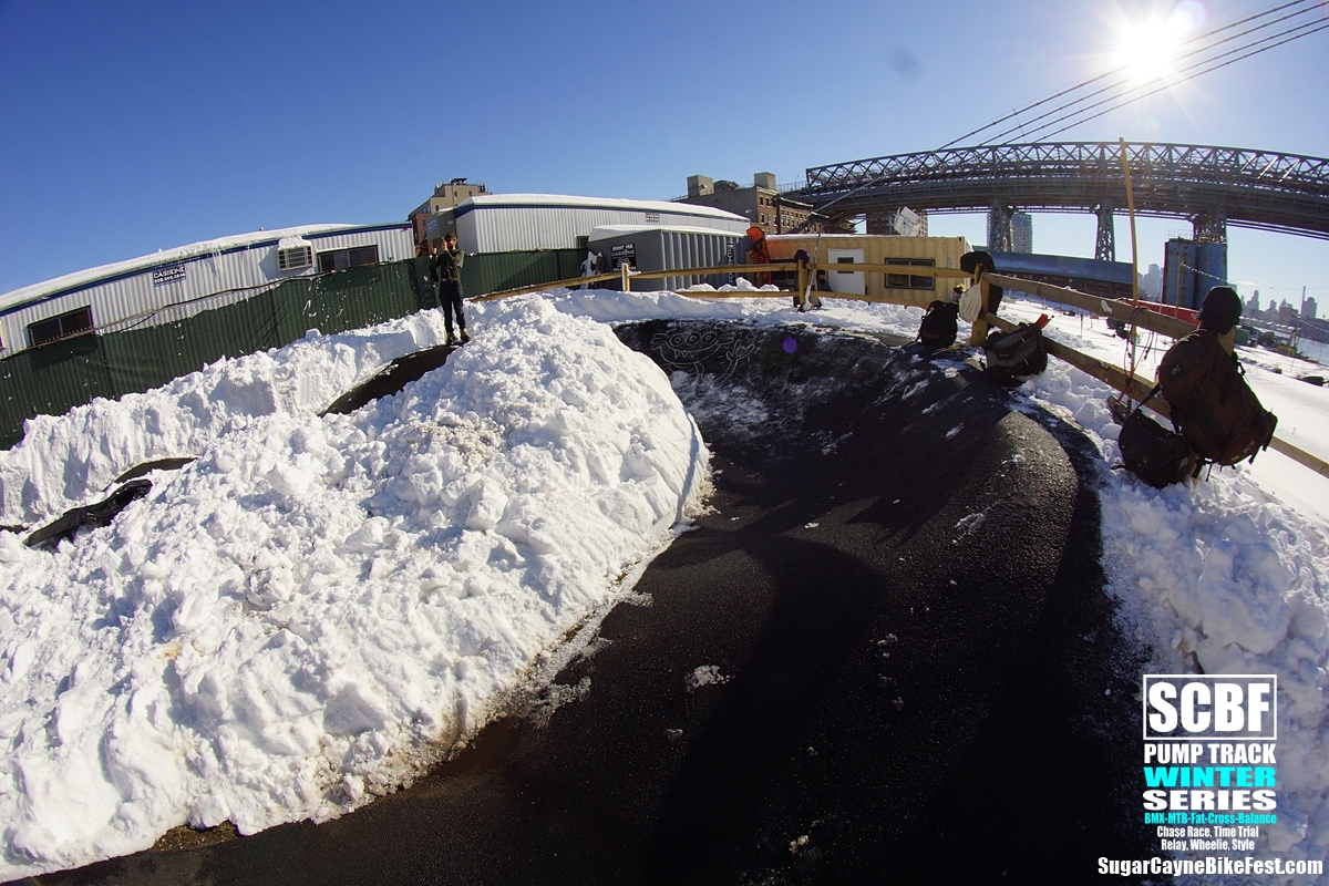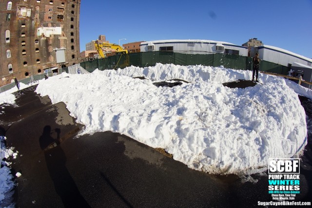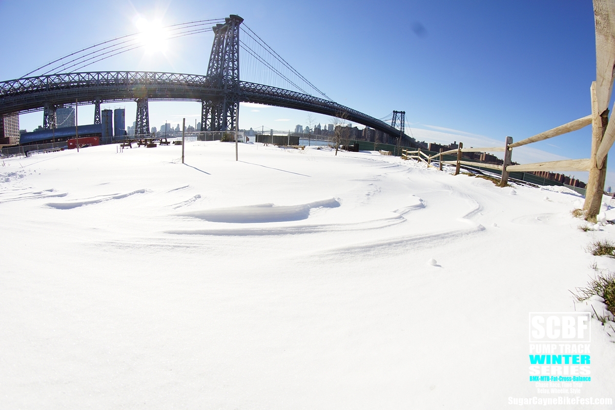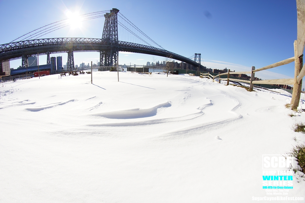 A day after the big blizzard of 2016 we all went out to Brooklyn Bike Park to try and session it. There was a retarded amount of snow covering the whole park and by time we got there Seth Freedman had a small crew of guys helping him to clear out the oval section of the pump track. On the big side of the track a few snowboarders tried to get the long rhythm section main line running. The snow was way too deep to try to ride a bike on it especially in the berm sections which were filled to the top with snow.