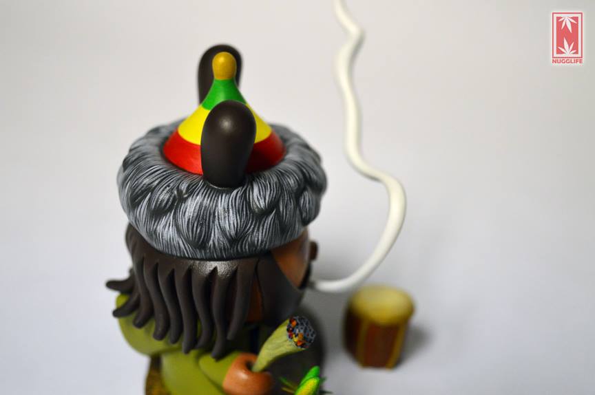 New York custom toy designer Ian Ziobrowski dropped an image of hos latest commission… “Reggie”! It a custom Kidrobot Dunny figure made to look like a weed growing (and smoking) Rasta. The character comes with his own plants, drum, and a giant spliff mon!
