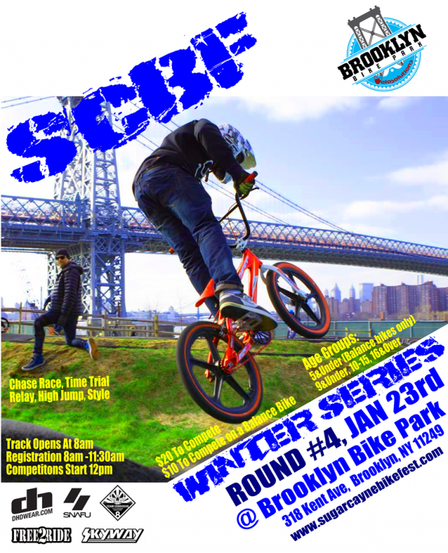 Round #4 of the SCBF Winter Series at Brooklyn Bike Park, New York City’s first paved pump track will be on Jan 23rd. There will once again be the time trail, time trial relay, best style and chase race, but this time there will be a high jump competition in place of the longest wheelie competition.