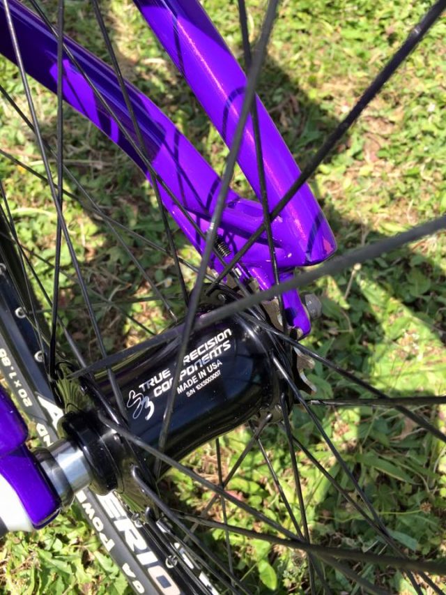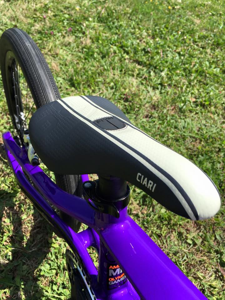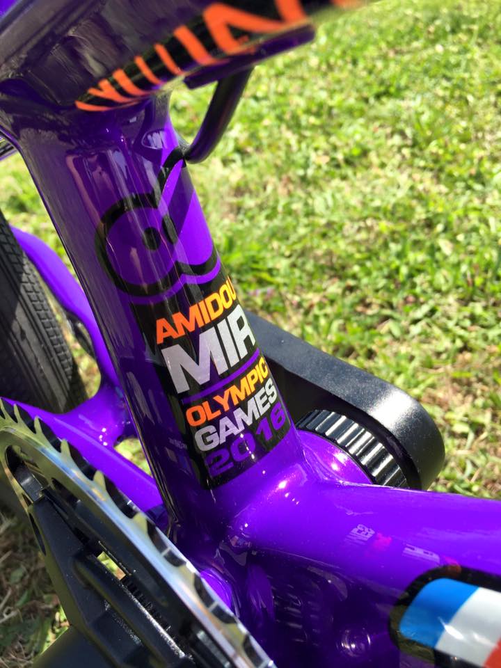 We’re not sure of the brand rims Amidou has but we do know he’s rolling on Stealth hubs and Tioga Power block tires. For the drive train a fresh set of BOX cranks, BOX chain ring and these cool purple HT Component pedals with his Amidou’s name on them. In one of the photos you can see the unique bend of the SUNN frame, the bike definitely looks tricked out!