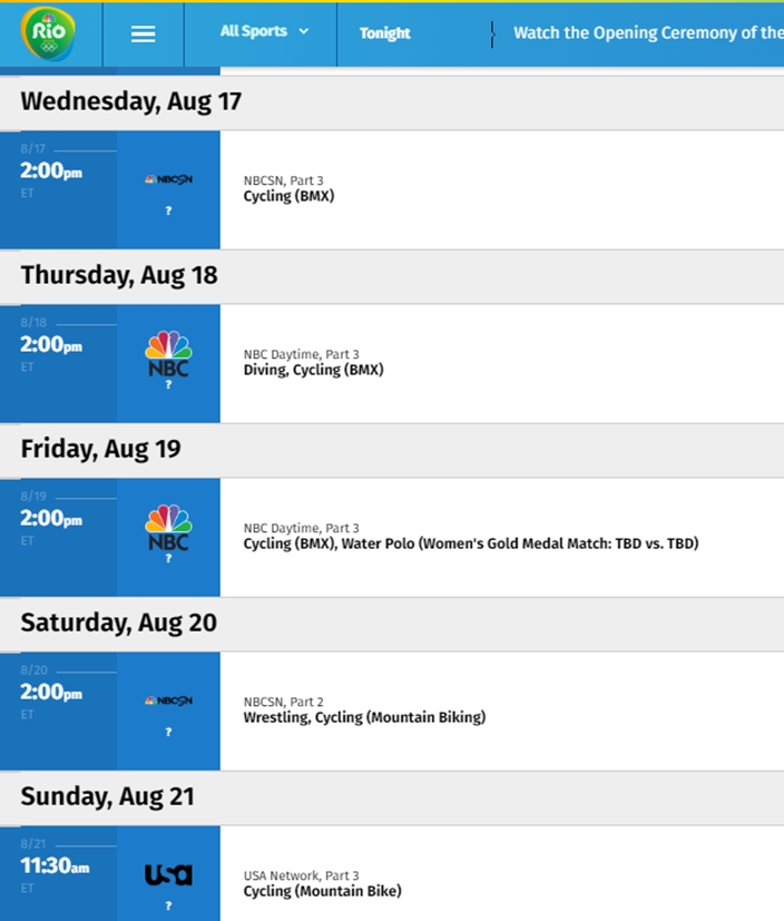 For some reason it is super hard to find out when the BMX racing and Mountain Bike events will be broadcast on NBC and it’s affiliate stations. The website with the schedule is super slow to navigate through and it seems like you have to go through layers of pages to get to it since they happen during the last few days of the Olympics. The other issue was some listings didn’t show the time zone that the broadcast was happening.