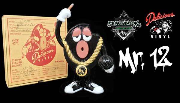 We spotted a dope new HipHop inspired designer toy figure called “Mr.12” and we had to share with ya’ll!! This sick Japanese vinyl figure by COOK & legendary record label Delicious Vinyl is sculpted by Kenth Toy Works and it takes elements from the Delicious Vinyl logo and incorporates it in the piece. The bite out of the Mr.12’s head and the face on his medallion are both elements from the label’s logo. The figure also featured a dookie chain, mic, blunt and fresh kicks. Mr.12 stands at 8″ tall, it has 6 points of articulation and it comes in a specially-made pizza box with signed postcard! Pretty cool!!