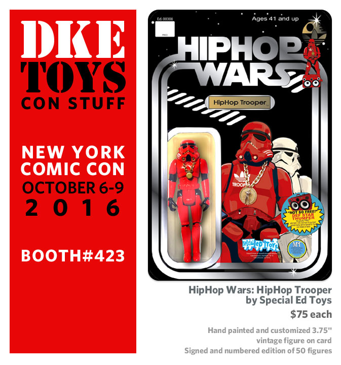 As the New York Comic Con approaches, press releases and teaser photos of some of cool stuff that will be at the event are starting to emerge. One of those cool things that’ll be at the convention is this cool HipHop Wars:HipHop Trooper figure by Special Ed Toys. This dope piece inspired by the HipHop Trooper cosplayer STRYDER will be available at the DKE Toys booth and there’s only 50 of them available exclusively at NYCC