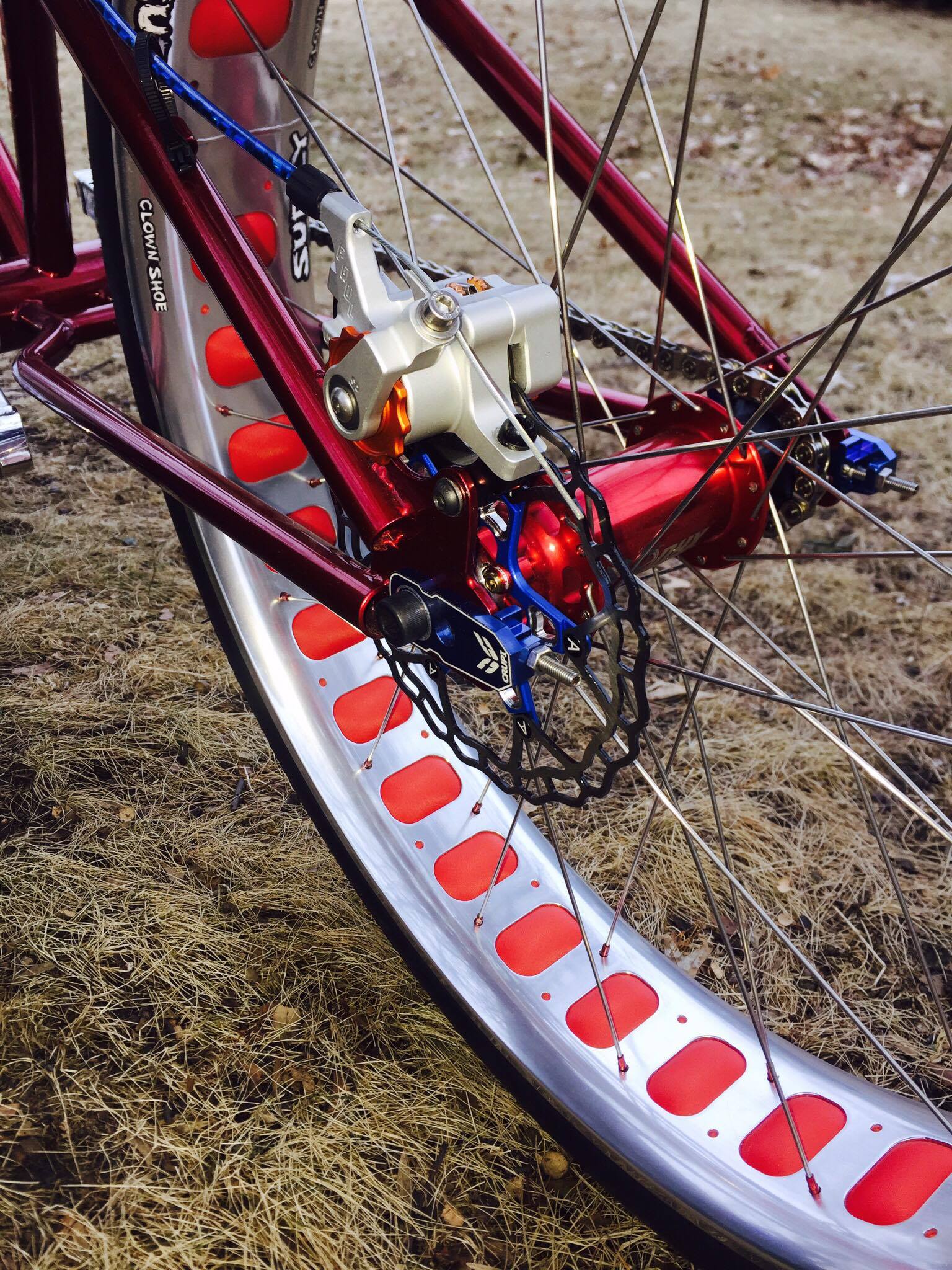 The 3 inch wide, low profile DURO Soul tires look sick on this bike and we’re diggin the big Soul logo. The also features chrome Bassett cranks, Red and blue Bassett stem, chrome Bassett handlebars, chrome Bassett seat post, Bassett pedals and bottom bracket, a real nice and comfy Brooks seat, AME Grips, Surly Rims, Chris King headset,red Onyx hubs and a Paul rear disc brake.