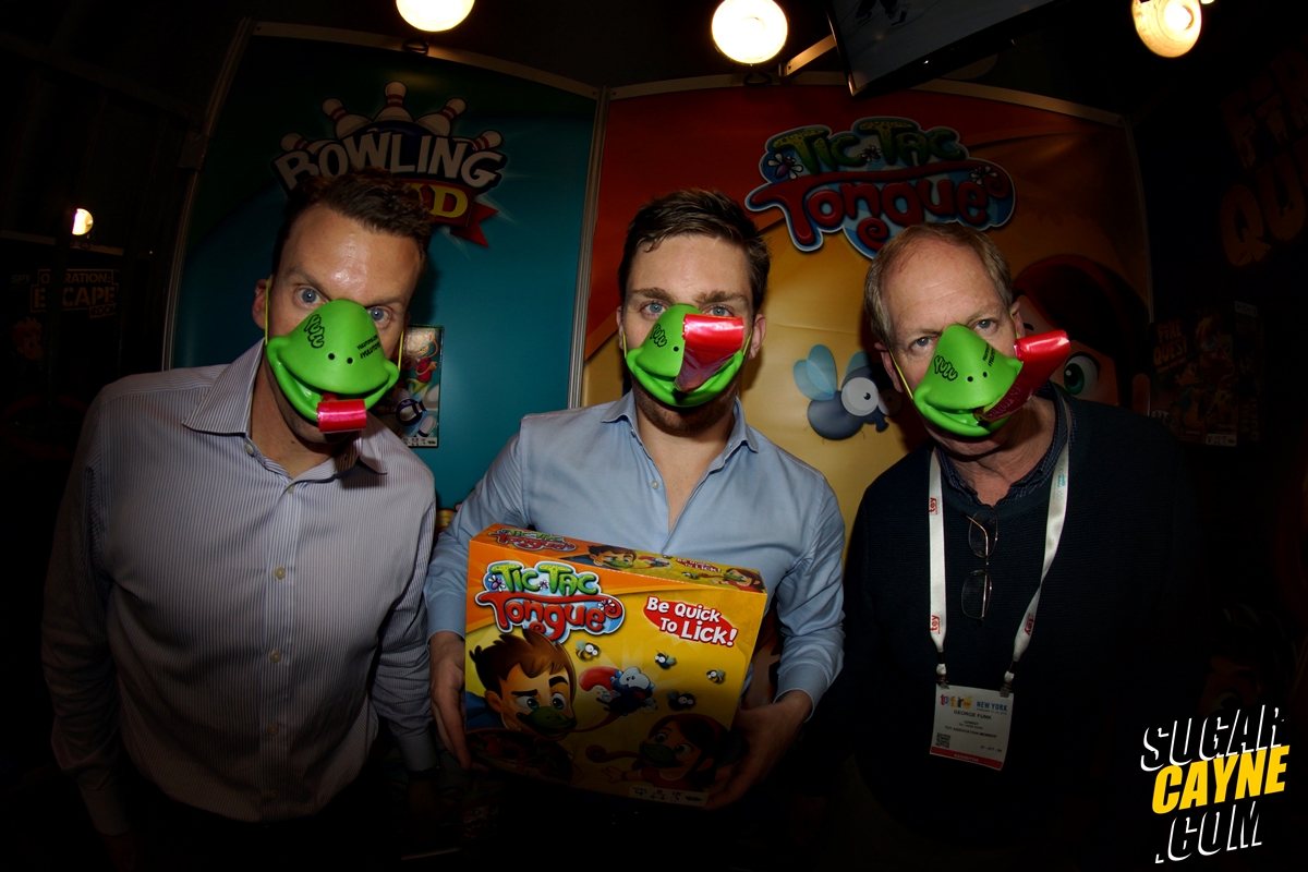 Jochem and Matt of Yulu Toys did a demo of the brand’s wild new game called “Tic Tac Tongue” at Toy Fair NY!! It’s a head to head game where players do battle like they’re chameleons. Already sounds wild right? LOL!! Ok check it…… 2 players put on a chameleon mask over their mouth and blow into it. The mask features a a long tongue that rolls out really fast when you blow into it mimicking a chameleon’s tongue.