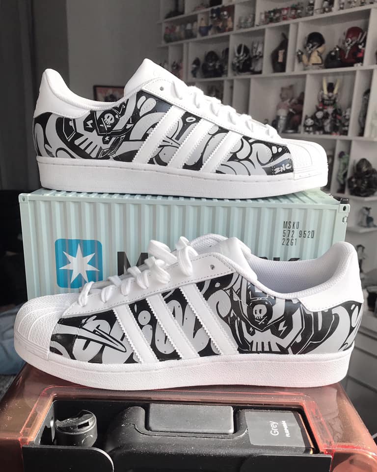 Quiccs Maiquez, the mastermind behind the popular TEQ63 designer toy figures posted a photo custom Adidas. The sneakers features a black and white graphic of TEQ63 and “Quiccs” along the side panels. The three stripes, shell toe, heel, tongue, laces, lace guards, mid sole and outer sole are all done in white. These kicks look super fresh! Quiccs didn’t leave much detail on the sneakers but we really hope these aren’t a one off.