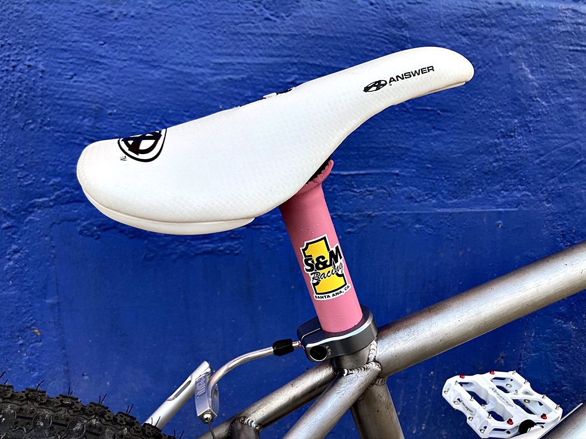 A colorful 2022 S&M Steel Panther sets off the April Bike Of The Day features!! This one was sent in by Adrian H./ODGG21SF who hooked up his raw frame with some pink and white parts. He even threw some comp three’s tires on there for extra credit.
