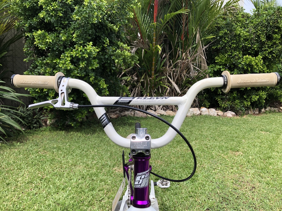 Today’s Bike Of The Day is a special one. It’s a 2013 Supercross Envy V3 and it was submitted by James Carter. It’s done in a nice purple and white colorway and features some dope parts! I’m loving the color balance on the bike with the purple frame and all the white parts. Those white wheels really make the bike pop! But what’s really special is James’s story behind the bike and it’s significance. It’s a beautiful story.