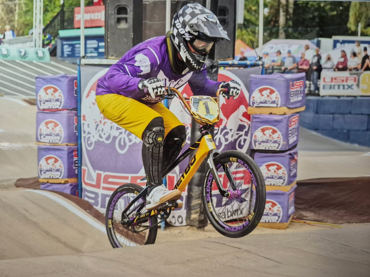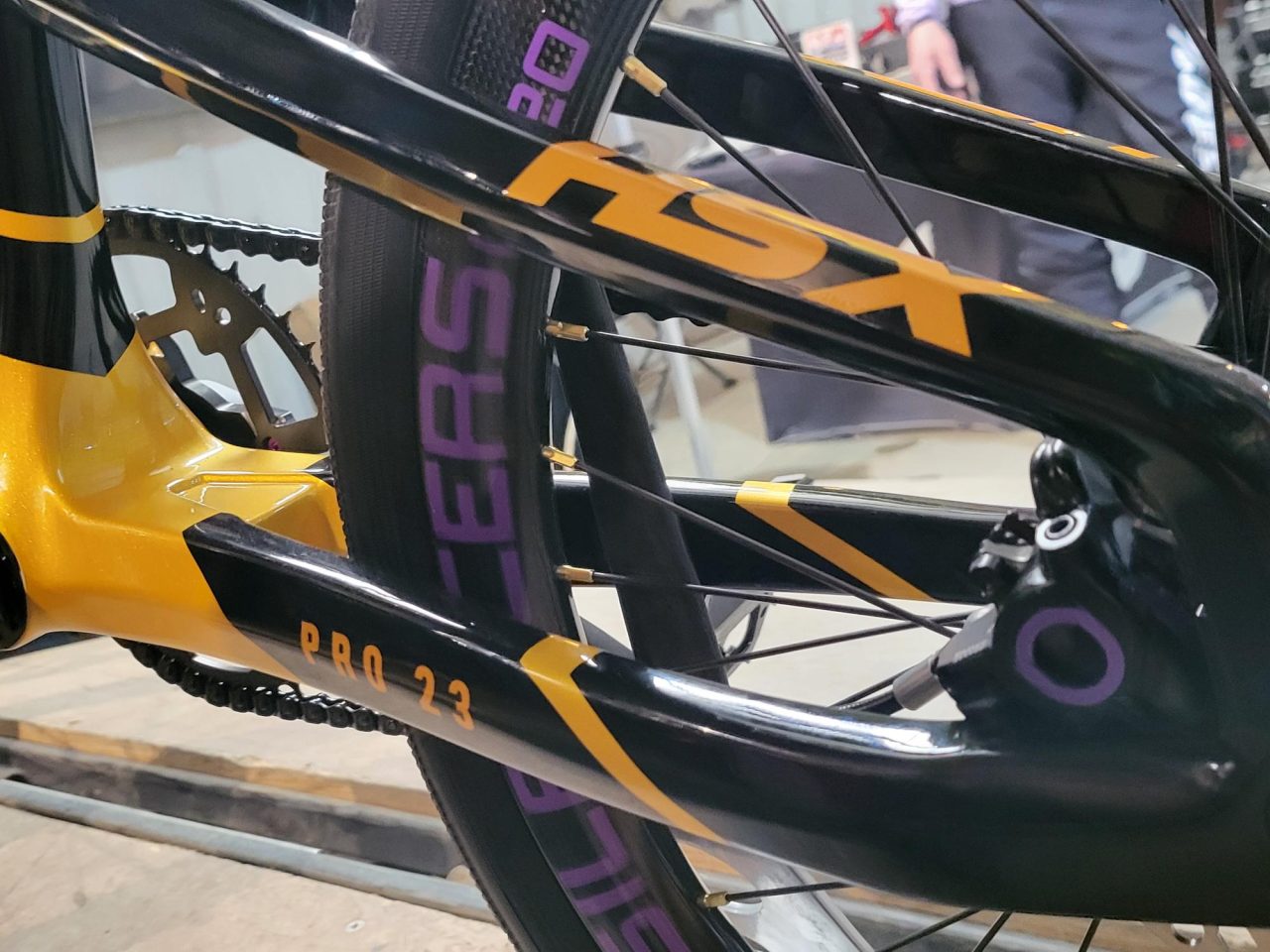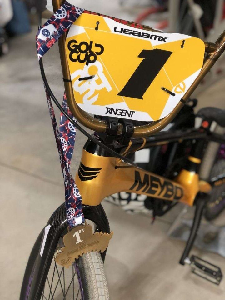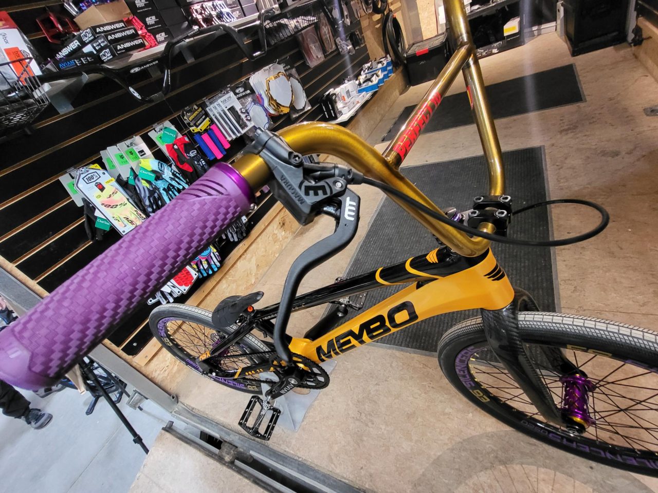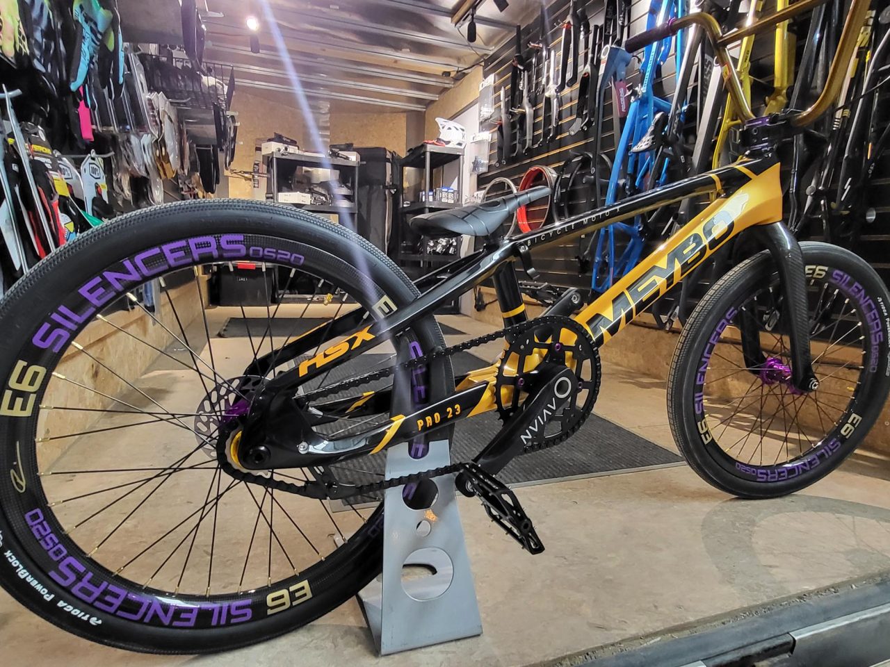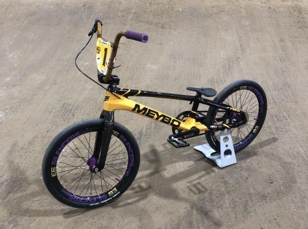 Today’s Bike Of The Day is a sick Meybo HSX carbon, OS20 BMX race bike! I love the bold color scheme on this build! The gold and black frame color and pattern is fire, plus the rear dropout and derailleur really brings the ingenuity up a notch! Continuing with the boldness are those E6 Silencer rims with their bold branding and purple offset color. There’s just so much to like about this bike but I want to know what ya’ll think via the rating sliders and comments below!