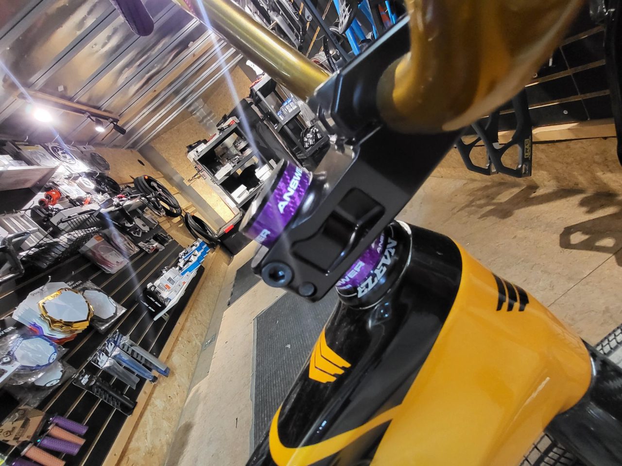 Built for one of our First Gear Fast team riders (Andy Bogart). Andy, in his late 50s, wanted to continue to push his racing abilities and go faster. He requested a unique build that would aid his goals, help his bike control with his Hight and lastly, have the bike be two of his favorite colors purple and gold. ~Rayn Weis