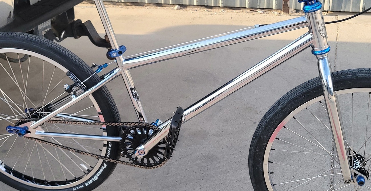 Our first show chrome finished BMX build of the year is this 1996 S&M Challenger International cruiser! This bike looks clean with it’s major parts done in a show chrome finish. The anodized blue parts are put in all right places with a contrasting brown touch on the seat and grips. Big shout out to Mark Goldstein for submitting this bike. Be sure to give it a rating via the sliders in the comment form below for the Bike Of The Month/Year Charts.