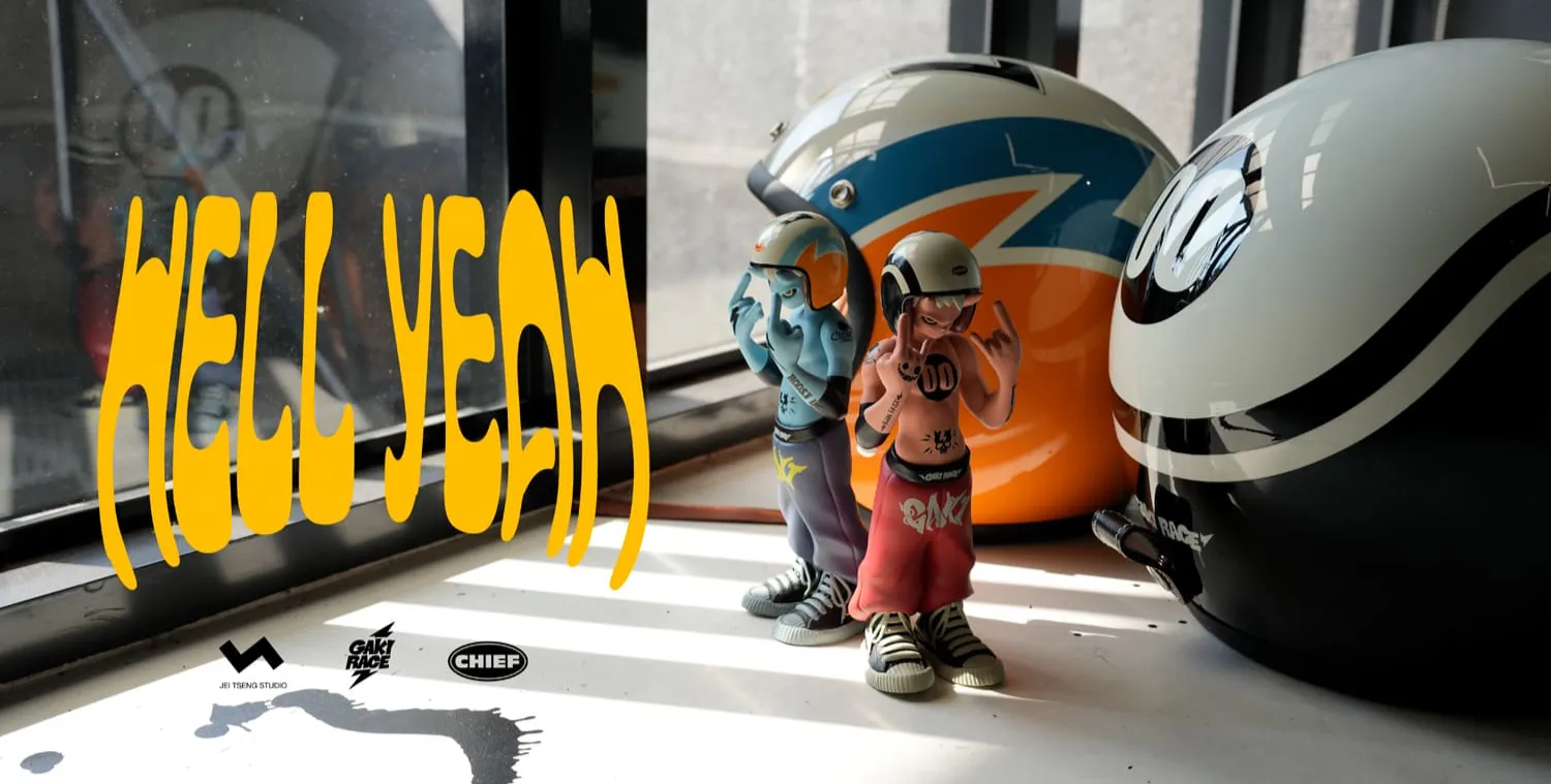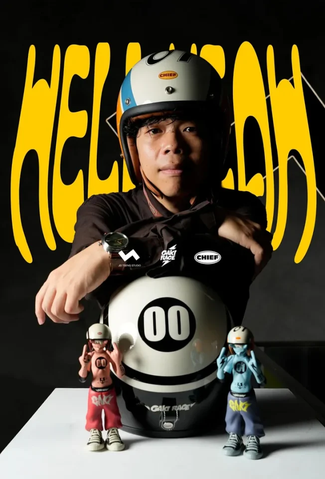 I’m bringing JTSTUDIO’s original IP, GAKI RACE, to the starting line for a massive collaboration with Chief Helmet, Taiwan’s premier vintage helmet brand. The origin of this project was simple, yet crazy. As a designer, I’ve always wondered: “What would it look like if toy characters stepped into real life?” And so, the “HELL YEAH” series was born. Many ask me, “Why are the GAKI RACE characters making that gesture?” ~Jei Tseng