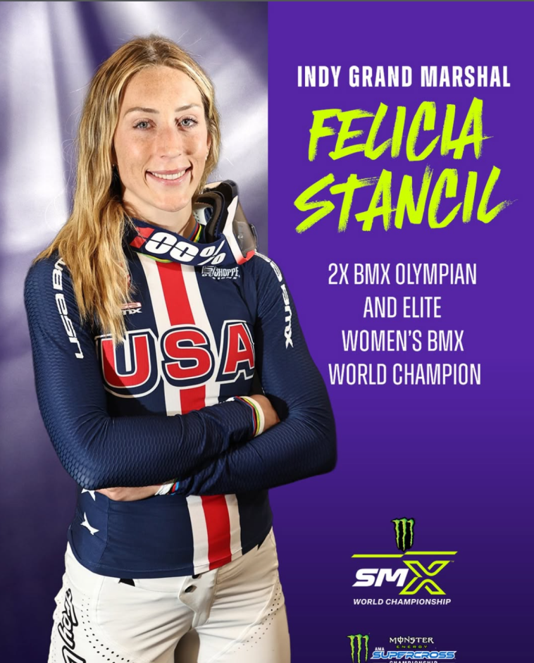 Women’s Pro BMX racer Felicia Stancil was the Grand Marshal for round 9 of the Supermotocross race series! The 2 time Olympian represented for BMX which is a direct descendent of Motocross so it was a natural fit! This an awesome look for Felicia and for BMX (Bicycle Motocross) racing. I love that Supermotocross is showing BMX some love!