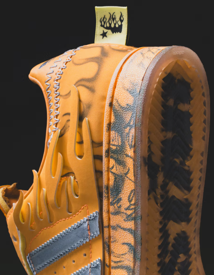 The iconic shell-toe kicks features a premium leather upper with tonal stitching. The bright orange color is met with the trademarked three strips in silver for a nice contrast. On the heel there’s the Hellstar logo tag sticking out the middle. It’s a different detail that you don’t see everyday. The grey flames look like they were hand drawn onto the midsole and upper.