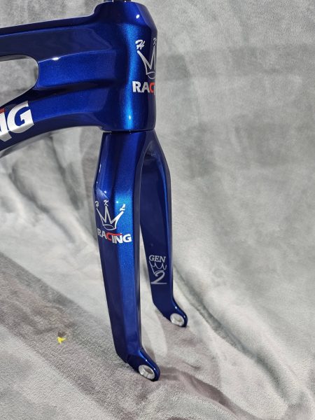 It’s a beautiful frame with an awesome blue paint job. And I love big bold branding on frames which this bike is sporting very well. There’s also matching carbon forks for the frame which has enclosed 20mm dropouts.