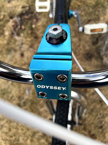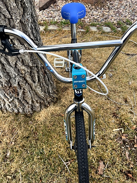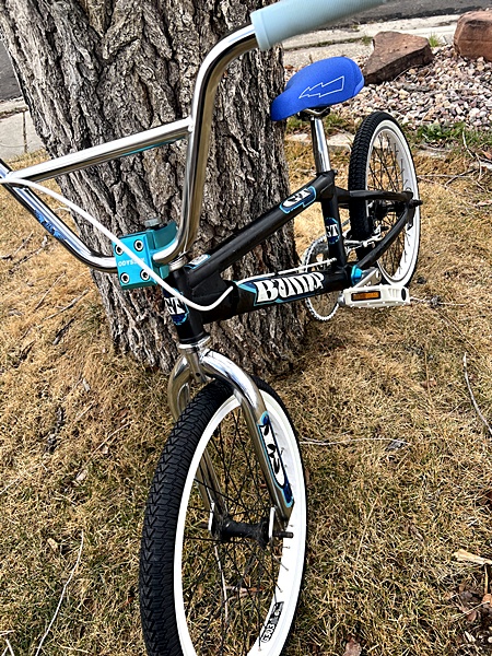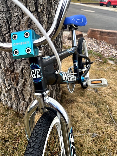 This GT bump was what lured me back into BMX. I saw it on marketplace in pieces and saw potential. The bike had no brakes, electrician tape grips, rusty black 14mm rims, rusted chrome cranks and sprocket, bars and seat post. It has some updated parts and some originals too. The cranks were the threaded 3pc and were rusted . The seat was original but pad ripped off, and worst of all the .070 GT stamped handlebars were cut so short they wouldn’t fit a brake handle and grips of any size so they went on my sons 12” with training wheels 🇺🇸 and swapped with new SE bars. Fully restored the bike and left the frame and forks in survivor condition on purpose. The patina makes it look tough, and I prefer the scars and story written all over it. Had to polish all the chrome for the rust and it all worked out eventually . Happy to save this from the Motel 6 it came from. ~Joshua Chandler